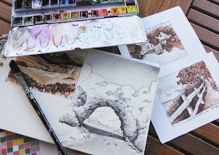 Besoin de peu de matériel glissé dans une valise: crayon de bois, gomme, boite d’aquarelle, un stylo bic noir (eh oui ! pas mal pour rehausser quelques dessins esquissés au sépia)  et du papier …